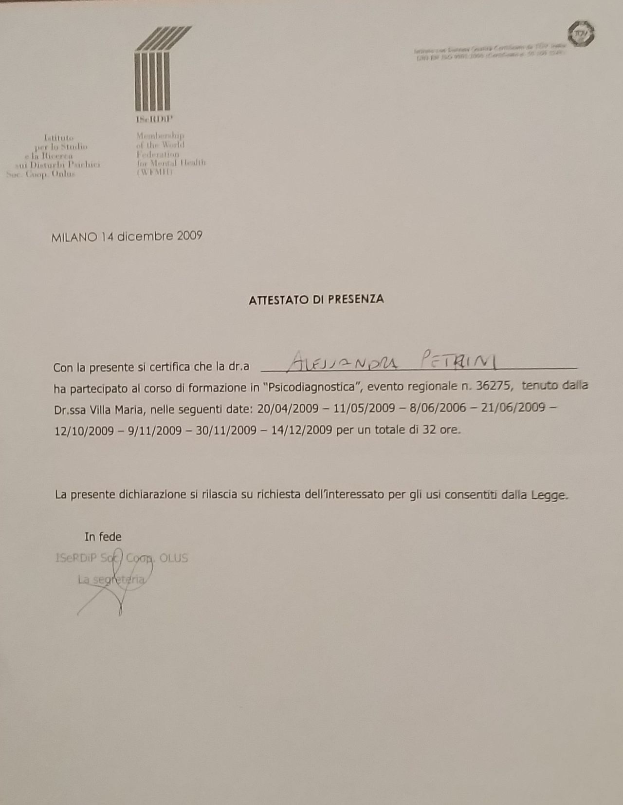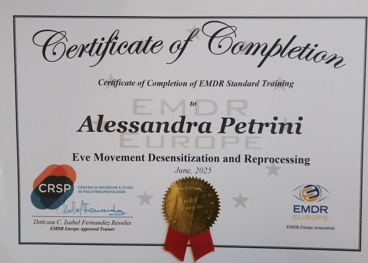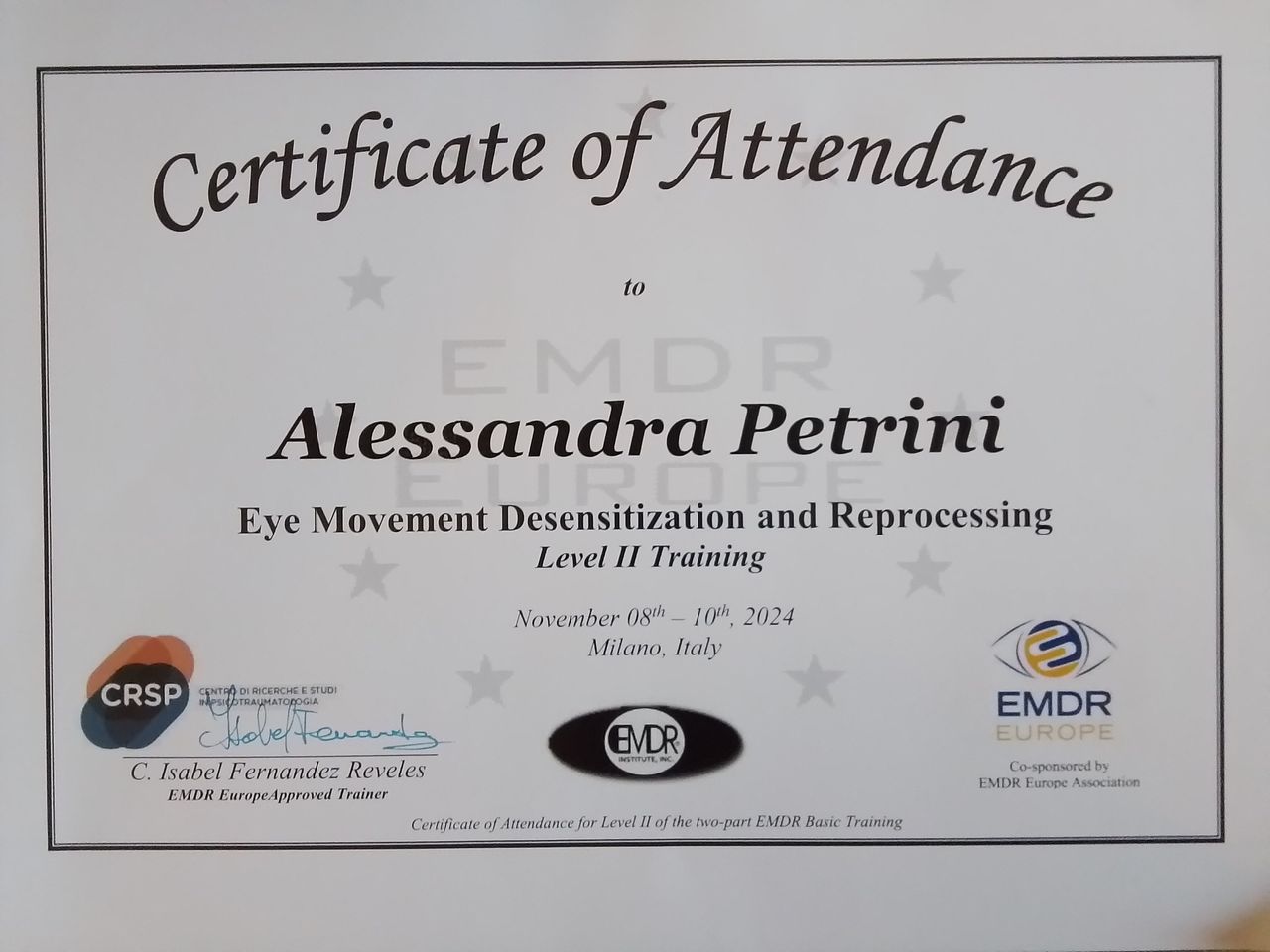 A questa formazione ho affiancato una Specializzazione in Psicodiagnosi nel 2010 presso l'ISERDIP (Istituto per lo studio e la Ricerca sui Disturbi Psichici) ed una più recente in EMDR - Master di Primo e Secondo Livello - (dall'inglese Eye Movement Desensitization and Reprocessing, Desensibilizzazione e rielaborazione attraverso i movimenti oculari), metodologia che scelgo talvolta di integrare ad hoc nei percorsi di cura che propongo.