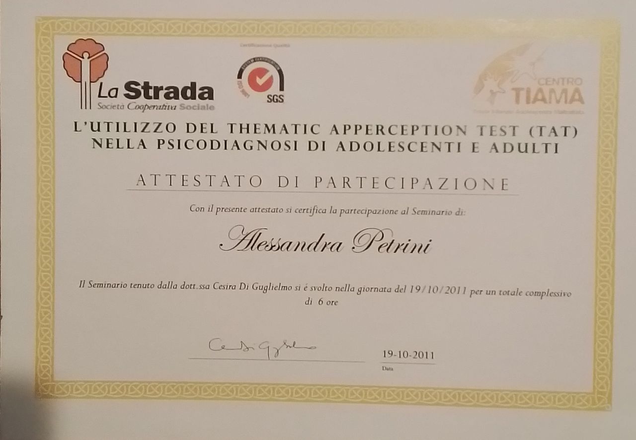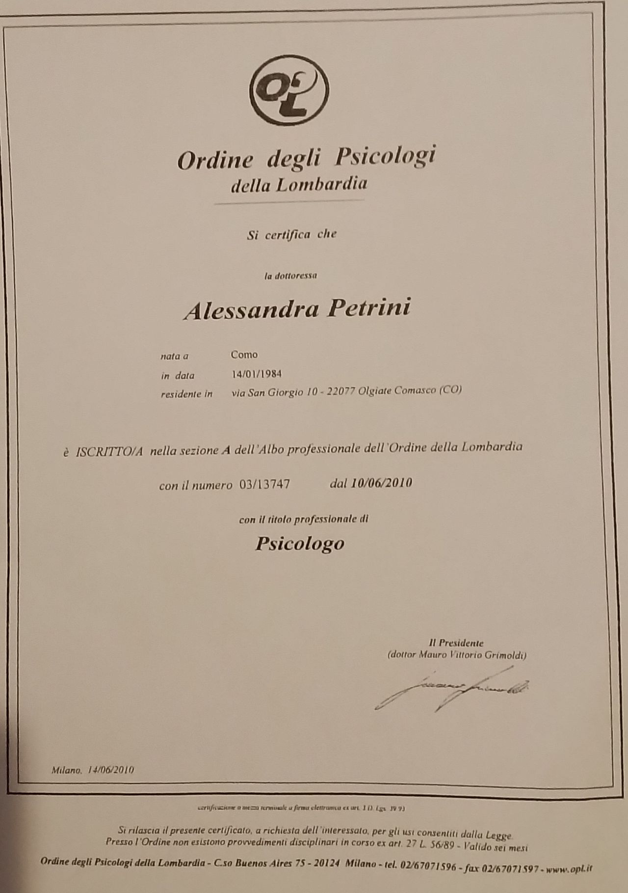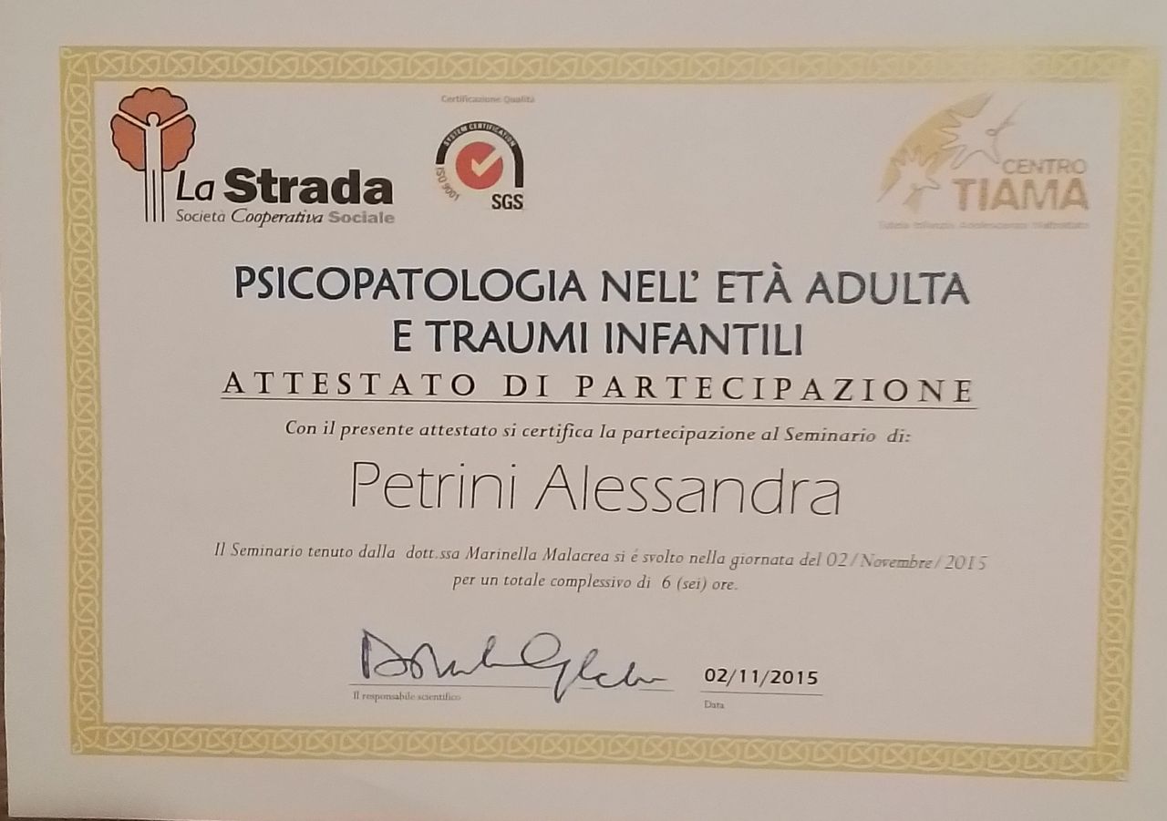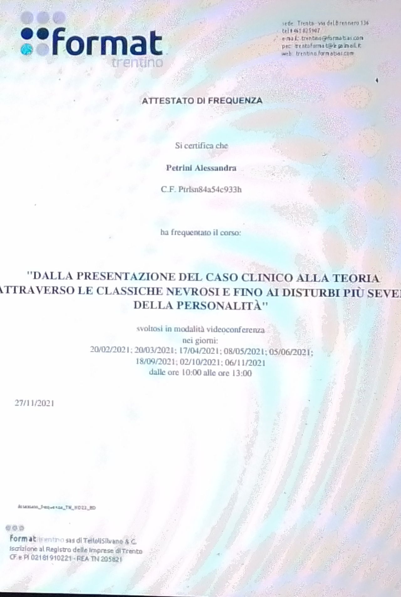 A questa formazione ho affiancato una Specializzazione in Psicodiagnosi nel 2010 presso l'ISERDIP (Istituto per lo studio e la Ricerca sui Disturbi Psichici) ed una più recente in EMDR - Master di Primo e Secondo Livello - (dall'inglese Eye Movement Desensitization and Reprocessing, Desensibilizzazione e rielaborazione attraverso i movimenti oculari), metodologia che scelgo talvolta di integrare ad hoc nei percorsi di cura che propongo.
