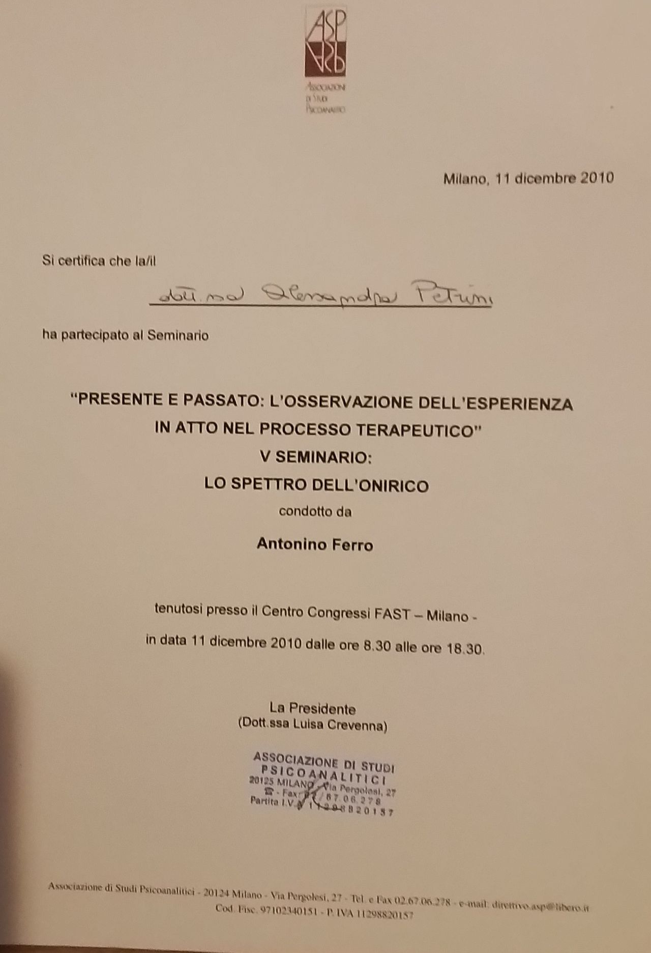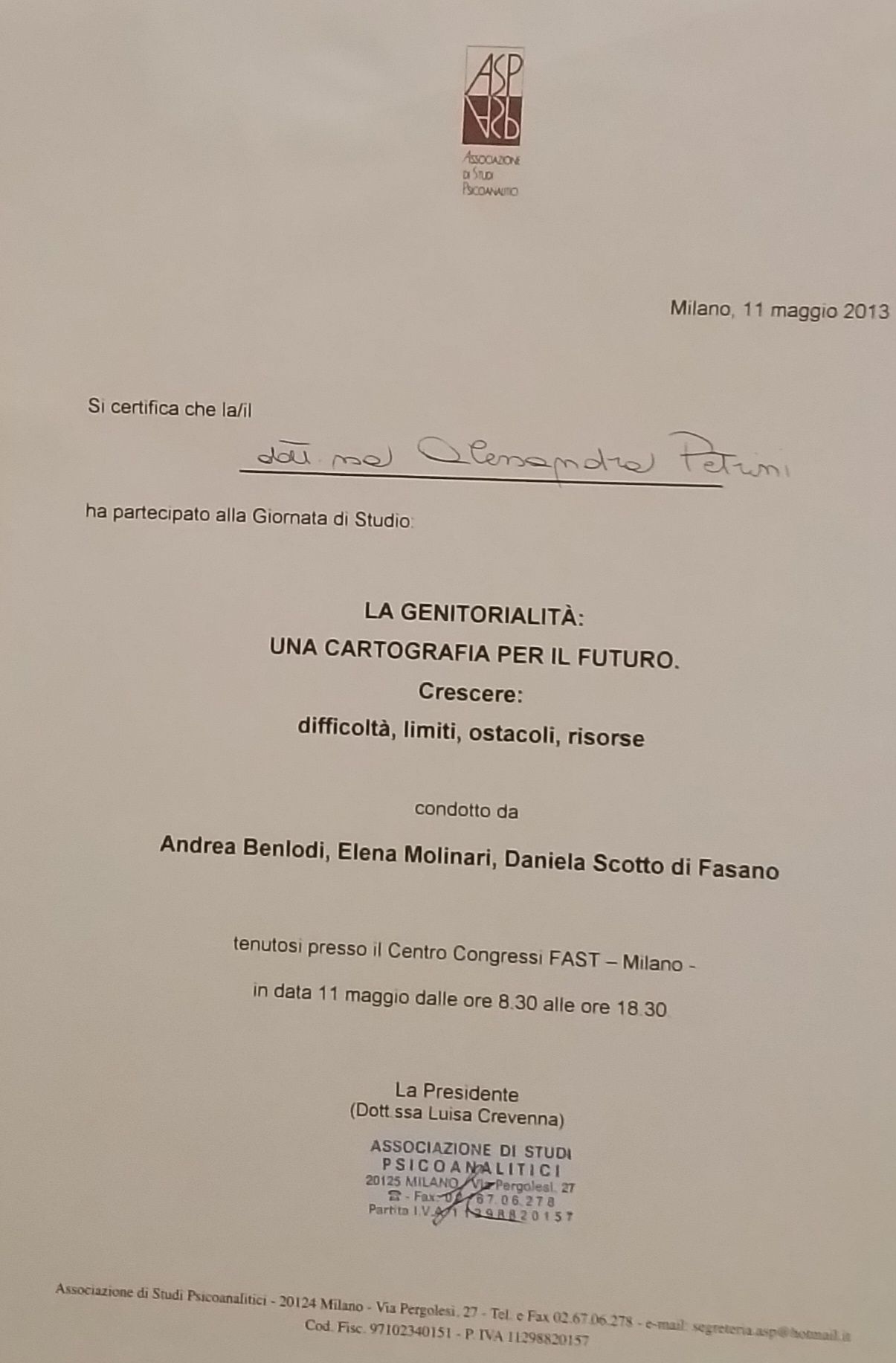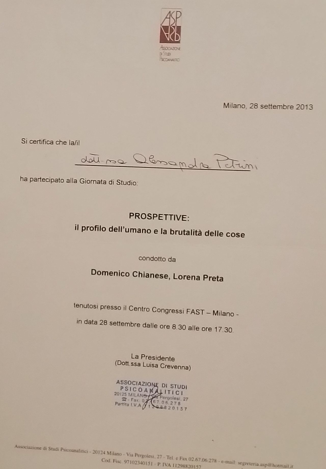 Proseguo ancora con grande passione la mia formazione partecipando ai seminari e convegni dell’Associazione di Studi Psicoanalitici (ASP) e a gruppi di intervisione clinica e di studio.