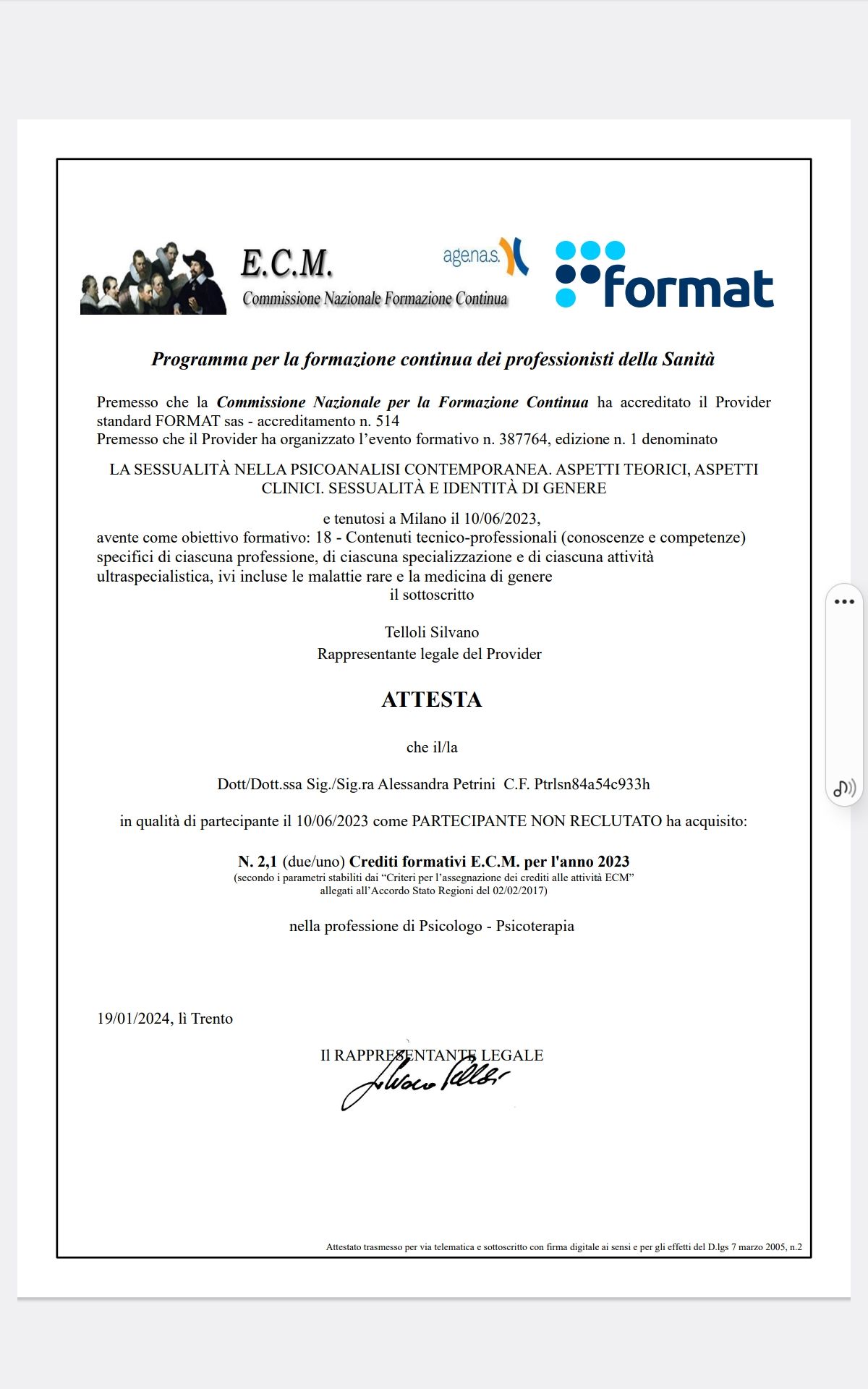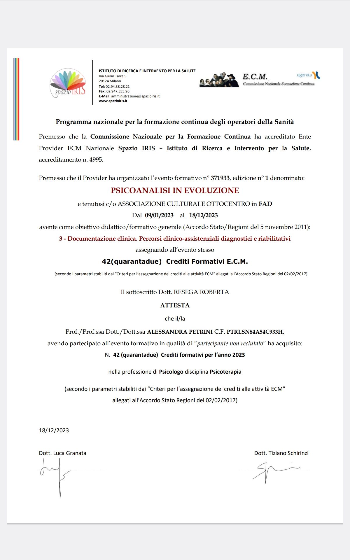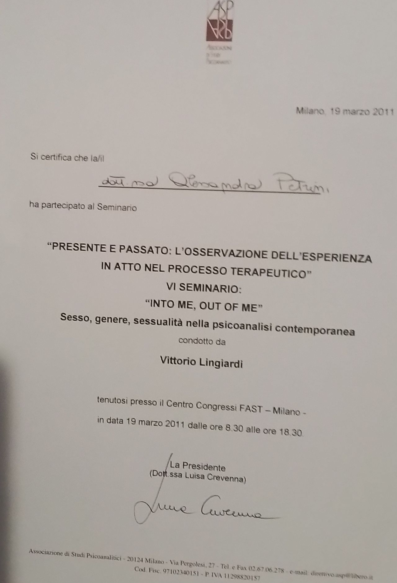 Proseguo ancora con grande passione la mia formazione partecipando ai seminari e convegni dell’Associazione di Studi Psicoanalitici (ASP) e a gruppi di intervisione clinica e di studio.