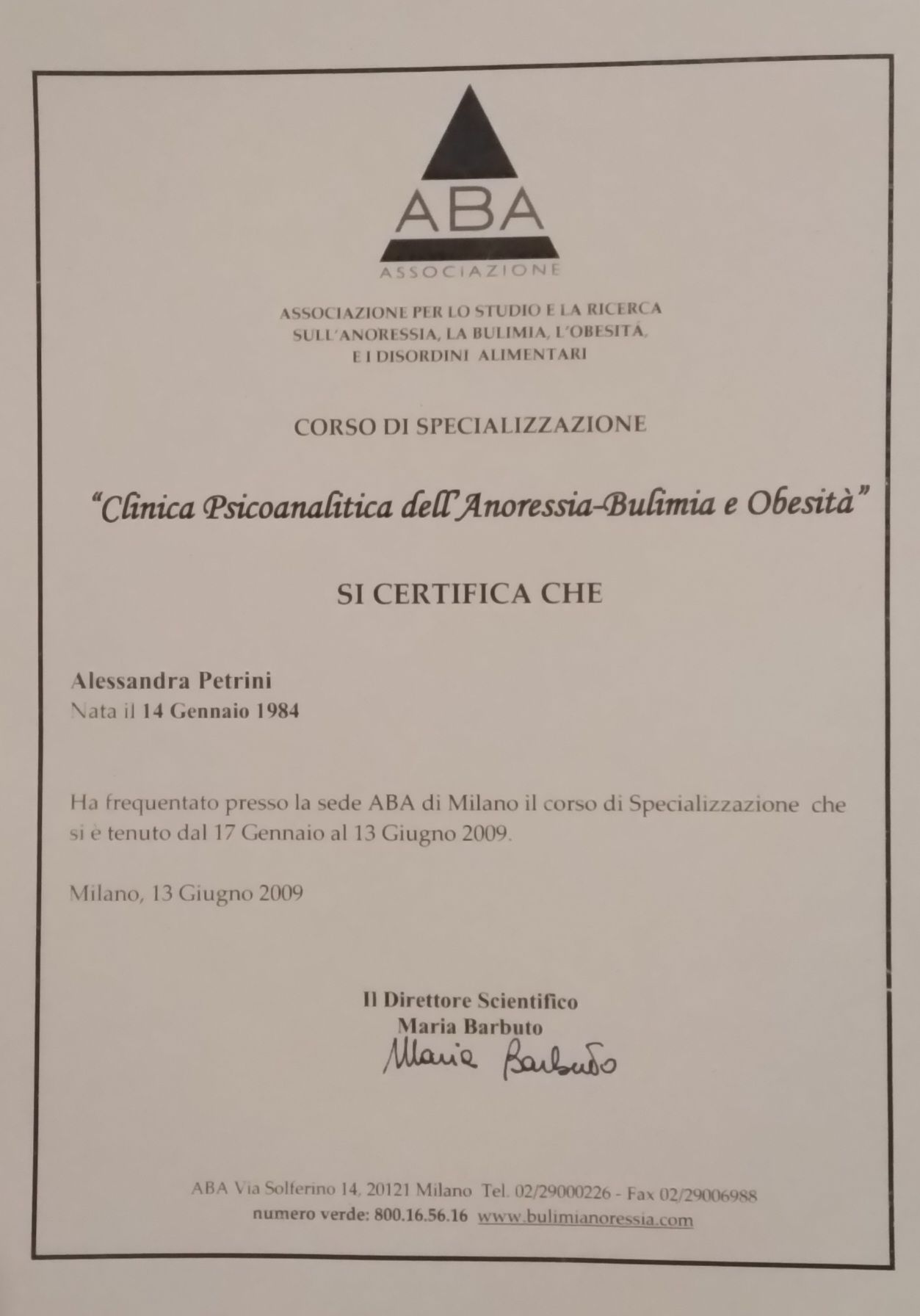 Dal 2010 collaboro con l’ABA (Associazione per la cura di bulimia, anoressia e obesità) come Psicoterapeuta di adolescenti, giovani adulti e adulti. Sono stata docente del corso di formazione dell’ABA sul tema dell’adolescenza e disturbi alimentari. Ho condotto diverse conferenze sul tema dei disturbi alimentari presso l'Associazione.