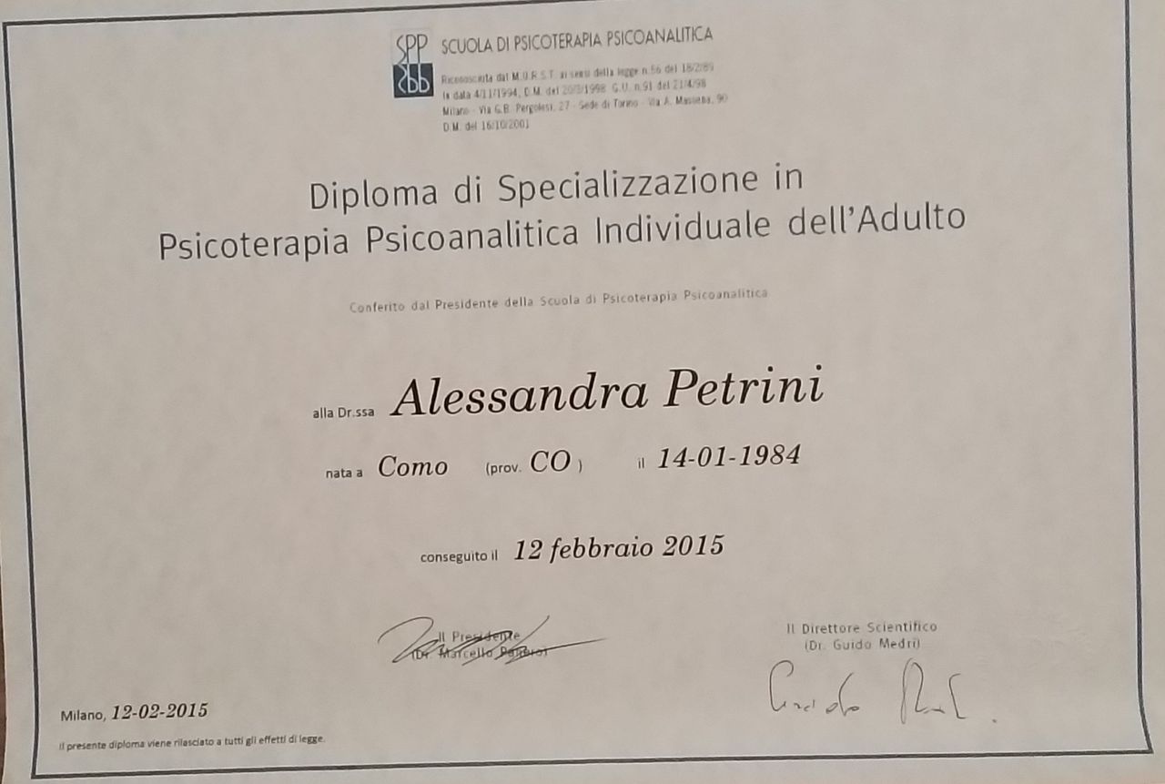 L'incontro con la Psicoanalisi all'Università è stato talmente significativo da scegliere una Specializzazione quadriennale Post Lauream in Psicoterapia Psicoanalitica presso La Scuola di Psicoterapia Psicoanalitica SPP di via Pergolesi a Milano. In questo percorso di intensa crescita conclusosi nel 2015 con il massimo dei voti e menzione di lode, fondamentali sono stati quattro ingredienti: la mia analisi personale, l'esperienza preziosa con i pazienti, le supervisioni sulla clinica con i miei maestri e lo studio teorico.